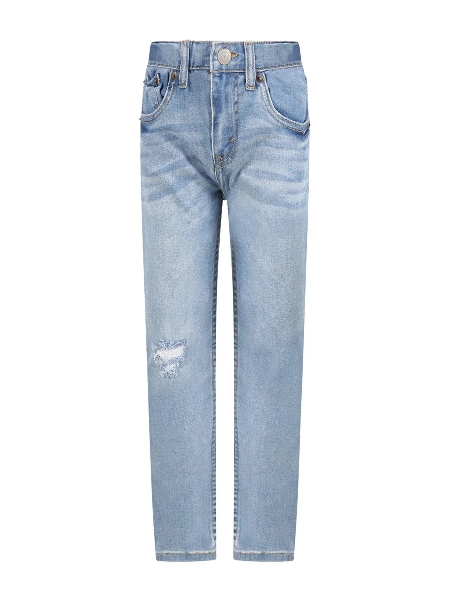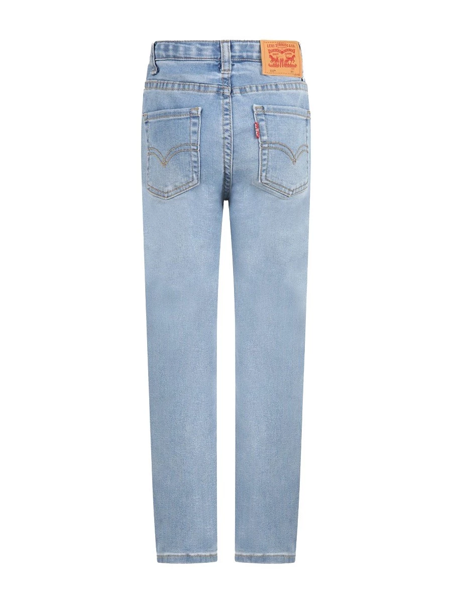 Jeans Levi's K 9EC752-L0L-KID-510. 53%Cotone 23% poliestere 23% viscosa 1% Elastene . Jeans skinny cinque tasche celeste denim, con chiusura con bottone e zip, sulla parte anteriore e vita regolabile grazie agli elastici interni con bottoni. E' decorato con iconico patch logato, sulla parte posteriore e finti strappi sulla parte anteriore. E' realizzato con bottiglie di plastica riciclate.