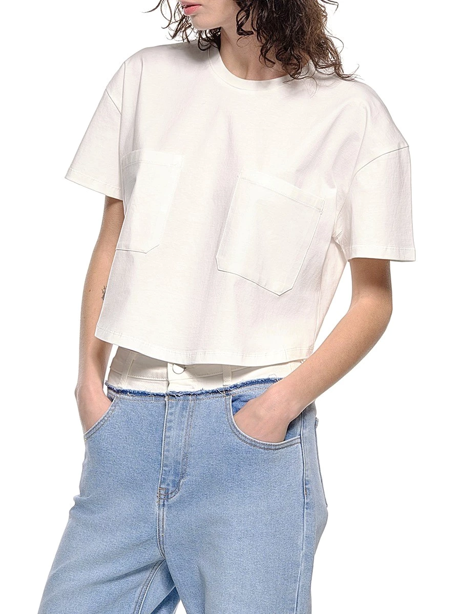 cod. LC23361 T-Shirt Lumina LC23361 100% Cotone T-shirt cropped realizzata in tessuto 100% cotone. Collo rotondo e maniche corte Presenta tasche anteriore. Vestibilità oversize, disponibile in taglia unica.